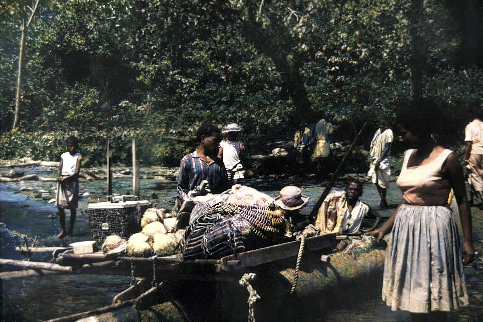 Loading the canoe to load on the Victor so not easy to go to Lae with 3 young children and especially with illness. She brings Bilums full of clothes and blankets to lay on the floor for the kids to sleep on, a cooler to bring some food for the 3 hour boat ride, the white hat shape container to ‘pee’ in, as well as vegetables the New Guineans are taking to the market in Lae.