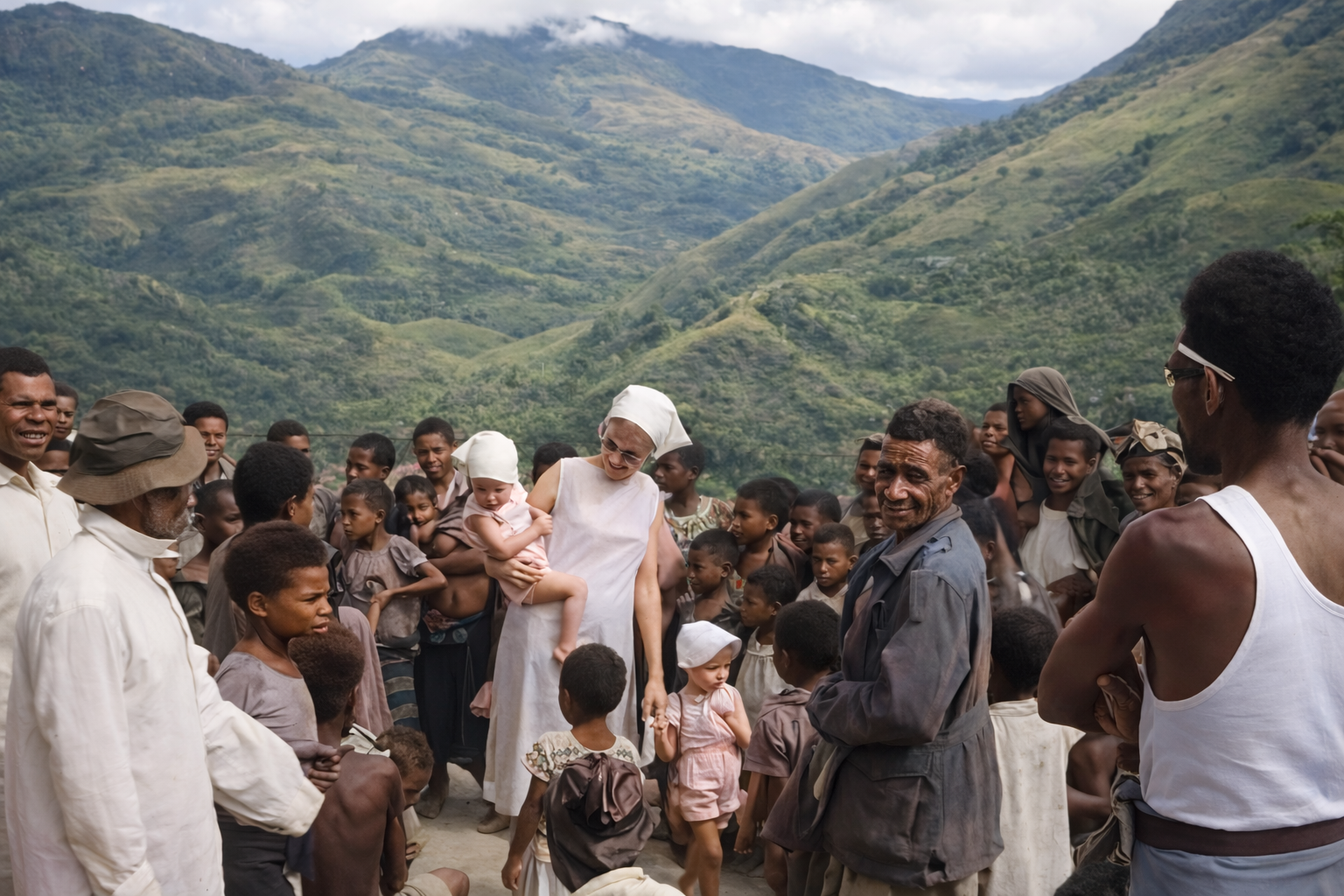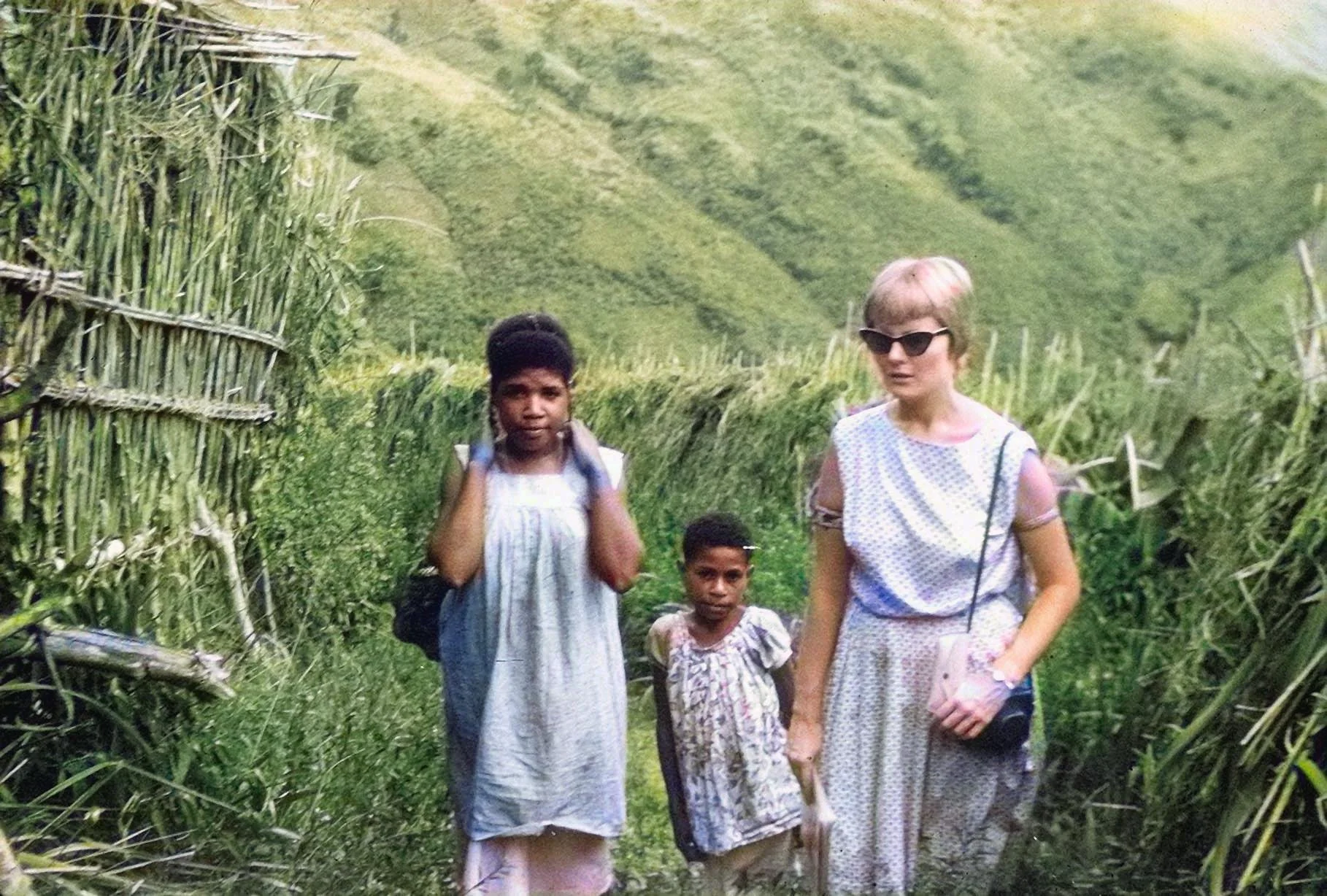 May /June 1963 Ina Erickson carrying Tom with Paula beside her in the Buangs.