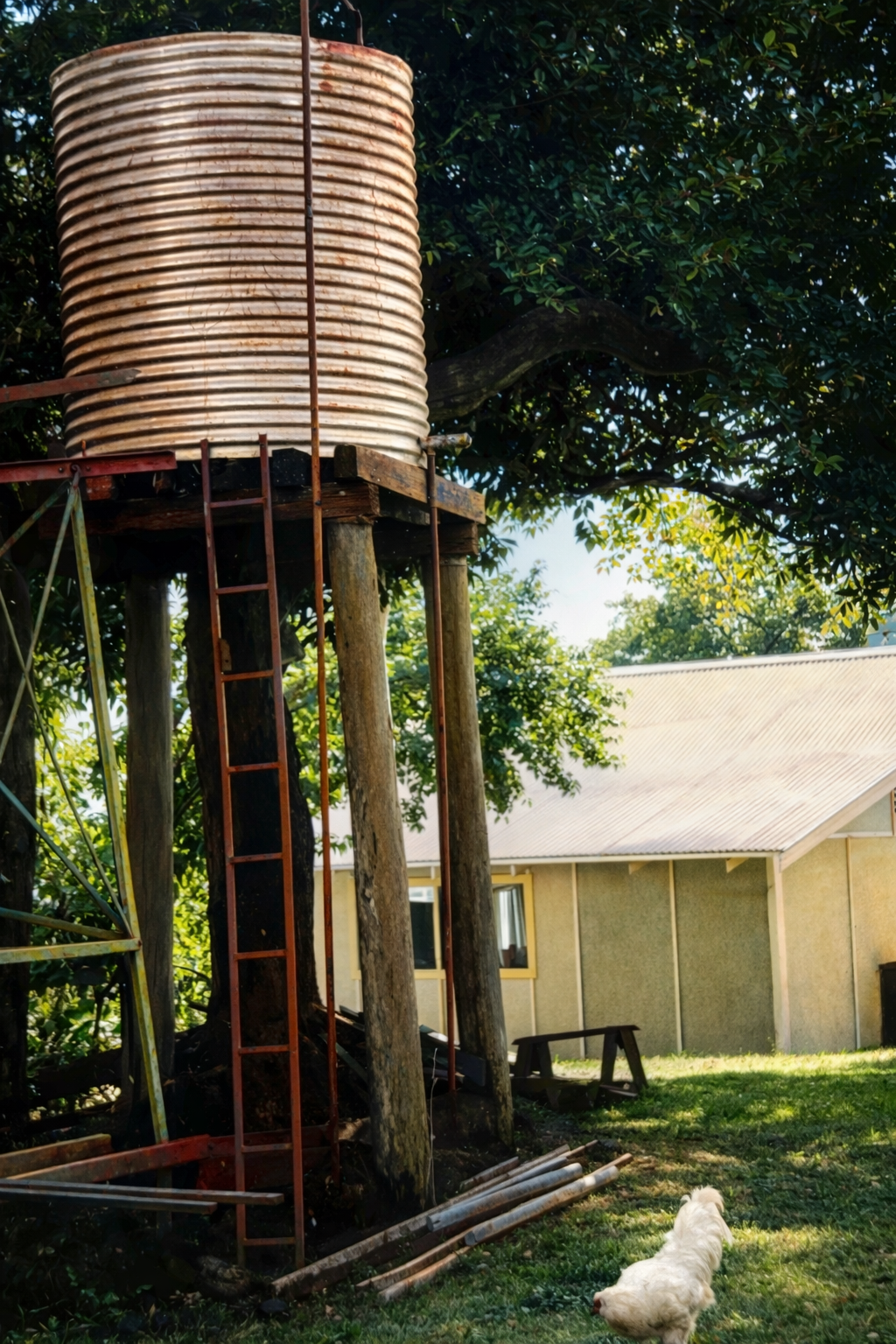 We had bucket showers in the bathroom unlike this photo which is outside. The bucket was let down by the pulley and filled with water and pulled back up. You opened the shower head at the bottom of the bucket. If you wanted a warm shower, water had to be heated on the stove and poured in the bucket.