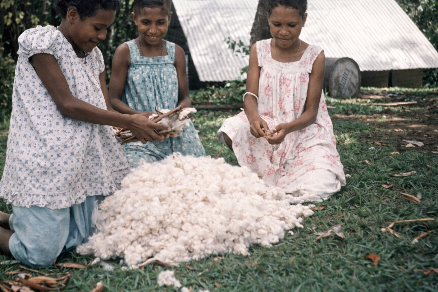 The one with the five girls standing beside a large building, is a side view of the new church, the girls are our nurses, except for the one on the far right, and she is planning to start nurses training shortly. The groups are the Sunday school class. I was trying to set them to show they’re offering up cucumber, corn, taro and what have you, but they were very bashful about displaying the food.