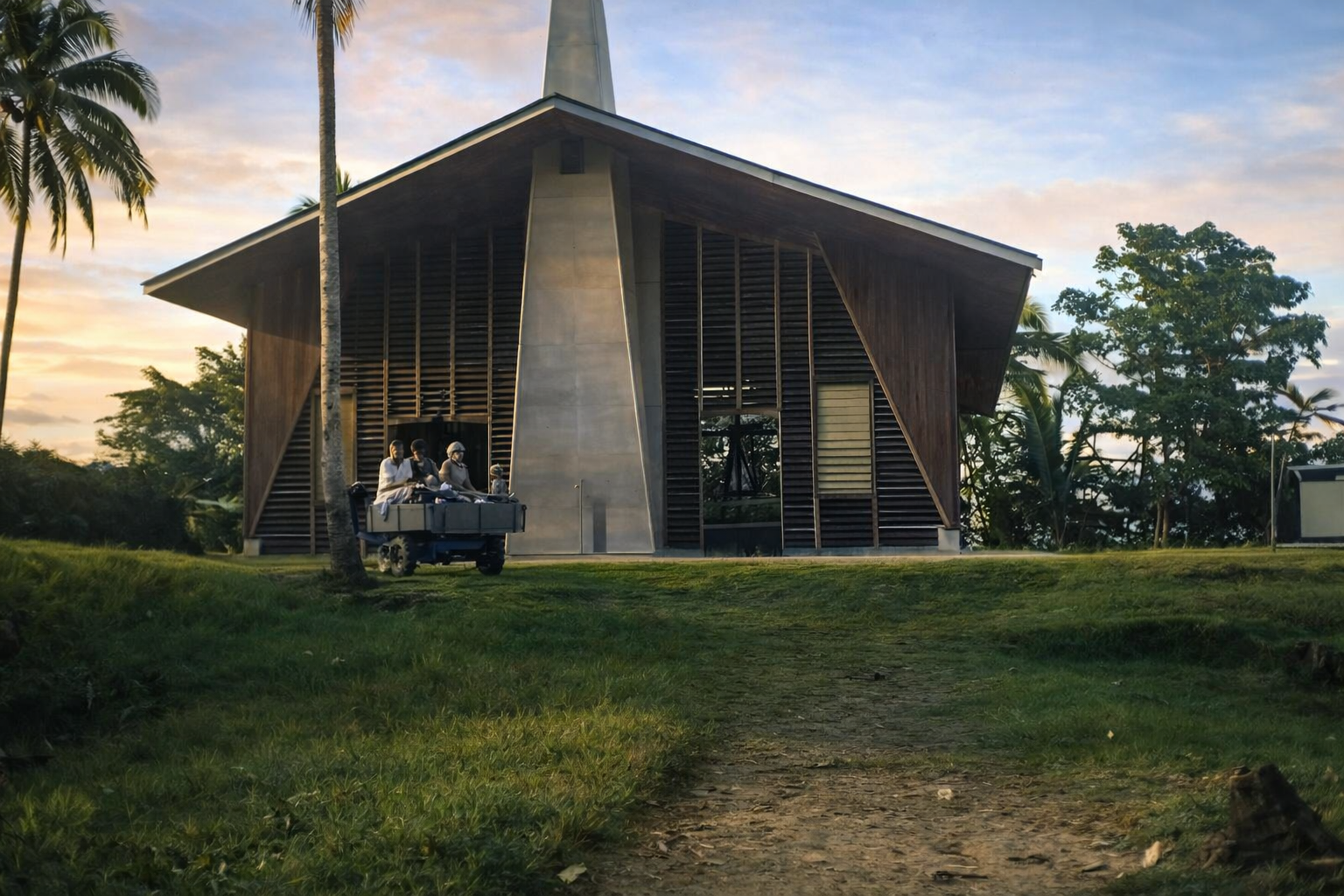 The Malalo church under construction. In the foreground is the foot path from the beach to the station house towards the left. Looks like the Tract grip on its way to the house.